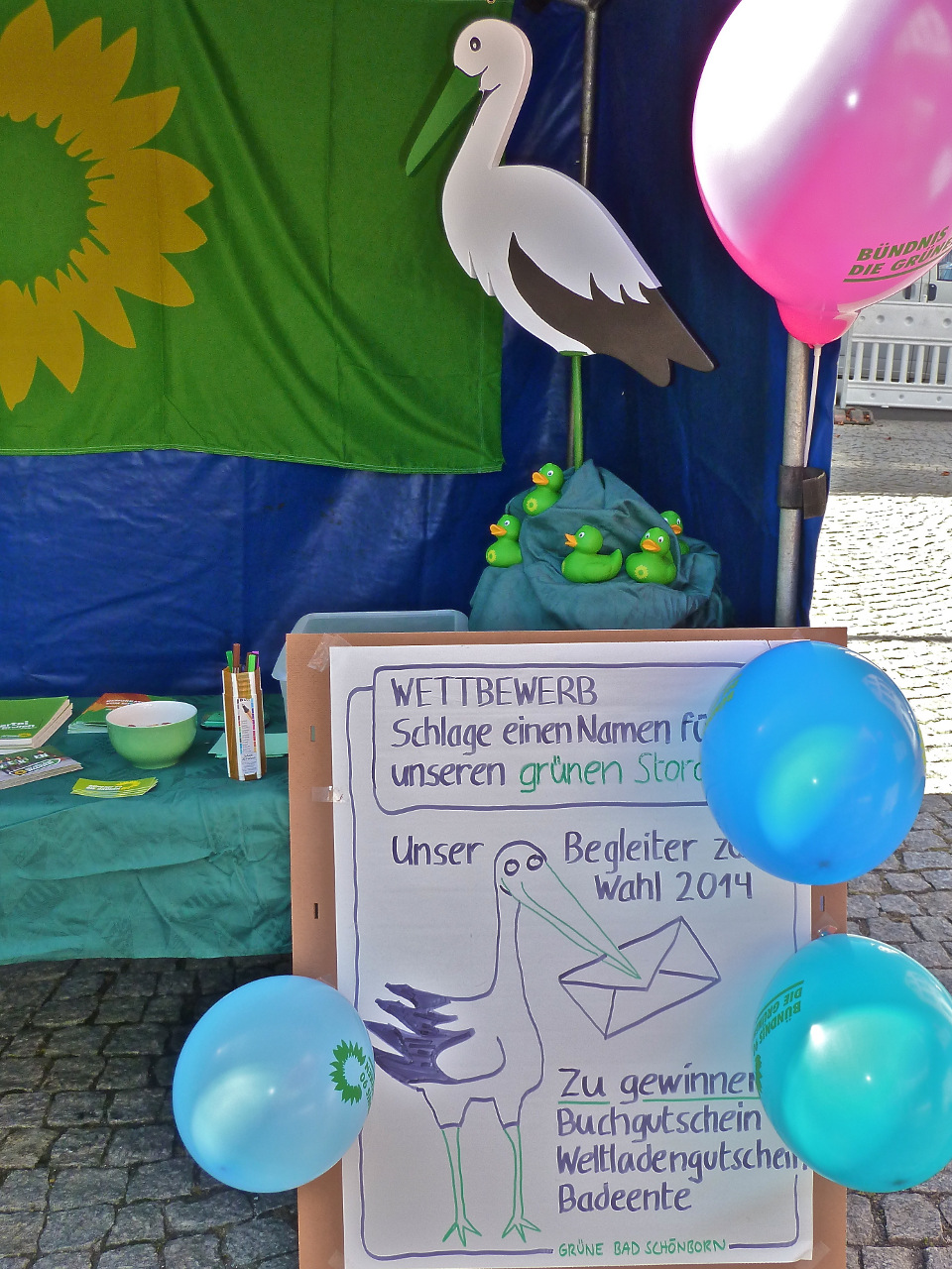 Überraschend viele wollten unserem Grünen Storch einen Namen geben. Der Grüne Storch wird uns auf dem Weg zur Gemeinderatswahl 2014 begleiten. Wir werden die vielen Namensvorschläge auswerten und unseren Interessenten und Mitgliedern eine Liste mit den zehn schönsten, passendsten, oder originellsten Namen zur Auswahl vorlegen. Das Ergebnis des Wettbewerbs wird auf der Mitgliederversammlung am 20. Oktober verkündet. Einzelne Kinder haben schon nachgefragt, wann das Ergebnis feststeht 😉