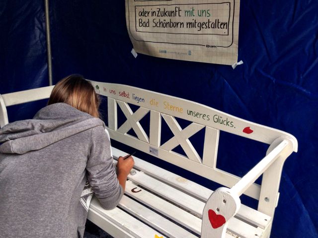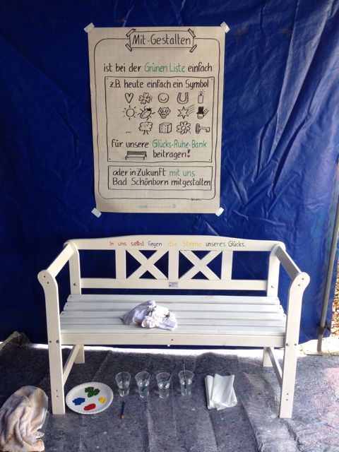 Viele Gespräche zu aktuellen Themen haben wir während der vier Stunden geführt. Unter dem Motto „Mit-Gestalten“ konnten die BesucherInnen die Projekte auswählen, die ihnen besonders am Herzen liegen. Einige v.a. Jüngere haben es auch gewagt und mit eigenen Symbolen unsere „Ruhe-Glücks-Bank“ verschönert. Dies als Beitrag zu einer Kampagne des Ministeriums für Glück und Wohlbefinden. Diese Bank wird genauso wie der Grüne Storch „Gunnar Grünschnabel“ vom Tag der offenen Tür 2012 unsere nächsten Aktionen begleiten.